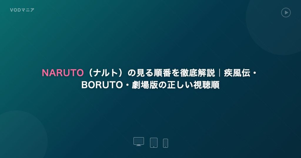 NARUTO(ナルト)アニメシリーズの見る順番を初心者向けに解説。TVアニメ(無印・疾風伝・BORUTO)の正しい視聴順、劇場版11作品の見るタイミング、アニオリのスキップ推奨話数、全話見放題の配信サービス比較まで網羅しています。 -