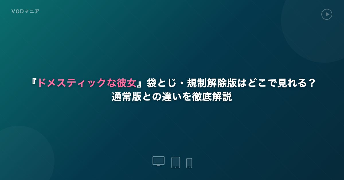 - A. DMM TVではドメスティックな彼女の見放題配信が確認されています。ただし、どのバージョン(地上波版/修正緩和版)かはDMM TVの作品ページでご確認ください。成人向けコンテンツに強いDMM TVなので、他サービスと比較して最もバージョンが充実している可能性があります。作品ページに「配信限定版」「修正解除版」等の記載があればそちらのバージョンで視聴できます。